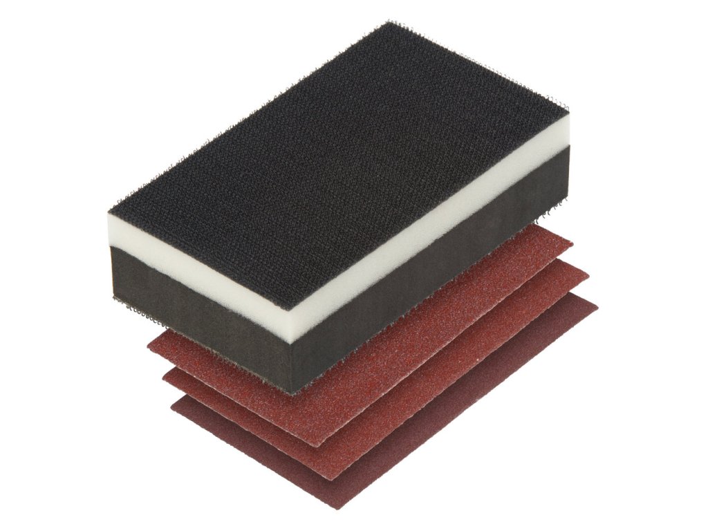 tvrdá strana k broušení ploch měkká strana k broušení obrysů se suchým zipem pro rychlou výměnu brúsneho papiera obsah: 1 x ručný brúsik , houbička, se suchým zipem na dvou stranách, dvojité tělo houbičky měkké a tvrdé, 125 x 70 x 35 mm 3 x samodržné brusné pásy, korund zrno 60, 80, 120, se suchým zipem, dřevo, plechy, plasty, 125 x 70 mm EAN: 4006885289208 Baleni: 125 x 70 x 35 mmDodatočné parametre