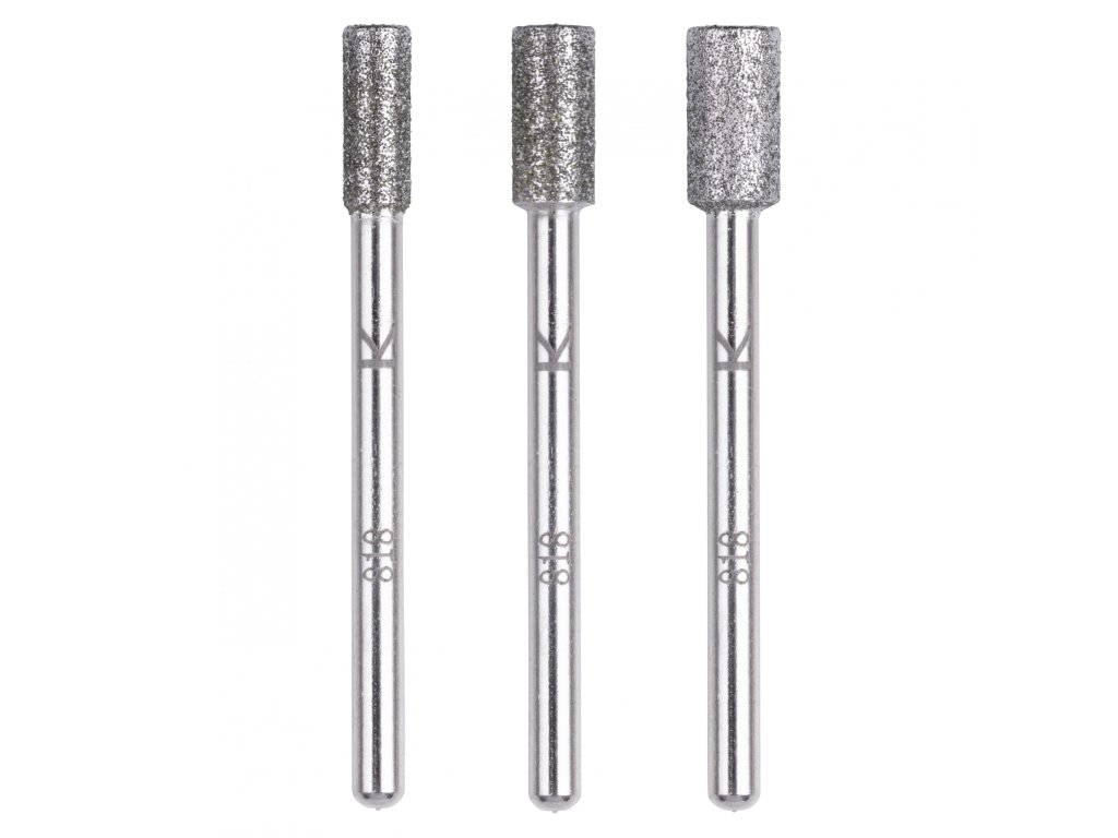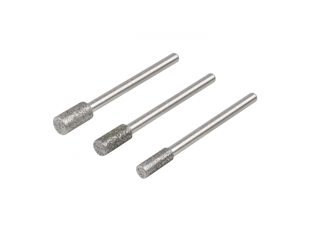 Mini brúsky s diamantovou brúsnou plochou. Určené pre keramiku, sklo, železo, farebné kovy, plast. Vhodné pre detailnú prácu s keramickou dlažbou, gravírovanie, rozširovanie otvorov. Pracovná hĺbka do 15 mm. Priemer hriadeľa 3 mm. Pracovné rozmedzí otáčok 8-15 000, len pravý chod. Sada obsahuje 3 ks brúsok s cylindrickou hlavou.Dodatočné parametre