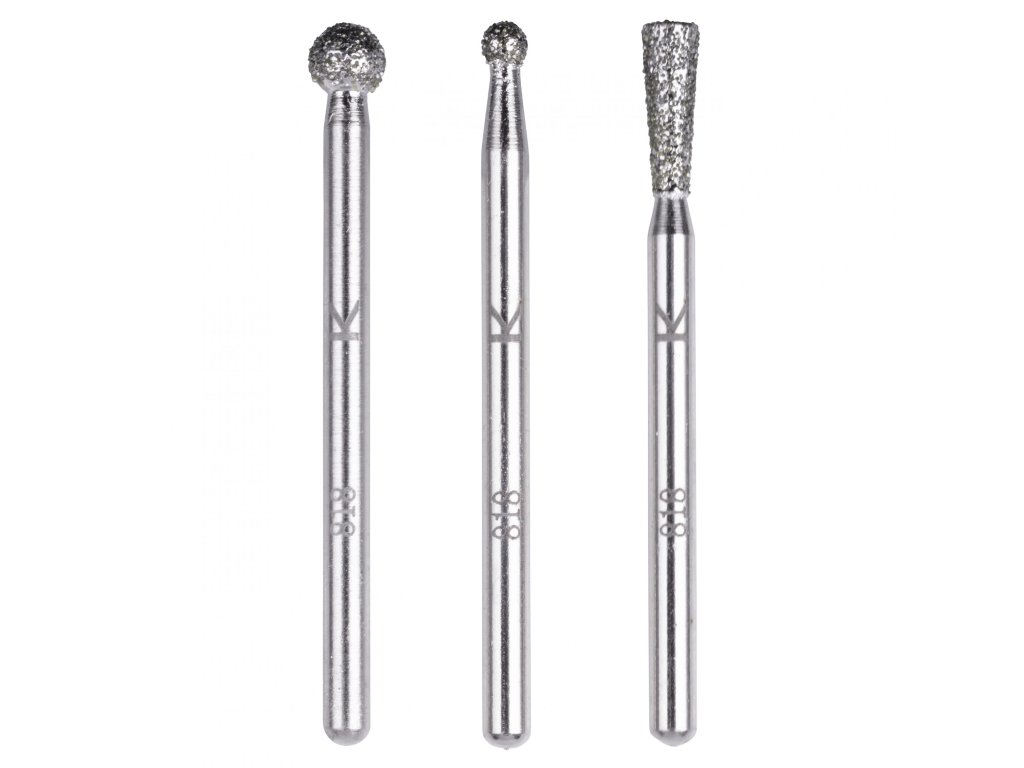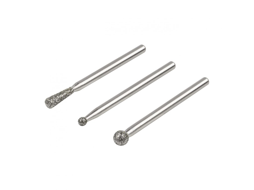 Mini brúsky s diamantovou brúsnou plochou. Určené pre keramiku, sklo, železo, farebné kovy, plast. Vhodné pre detailnú prácu s keramickou dlažbou, gravírovanie, rozširovanie otvorov. Pracovná hĺbka do 15 mm. Priemer hriadeľa 3 mm. Pracovné rozmedzí otáčok 8-15 000, len pravý chod. Sada obsahuje 2 ks brusky s kuličkovou hlavou a 1 ks s kónickou hlavou. EAN: 4006885598805Dodatočné parametre