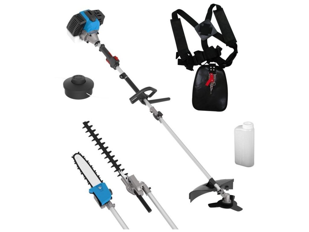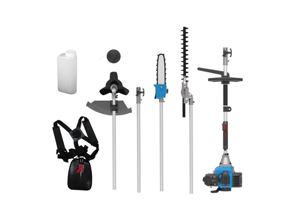 Sada pre všetky práce v záhrade, na dvore a na pozemku. Vzduchom chladený dvojtaktný motor, palivová pumpa, mäkká rukoväť, prídavná rukoväť. Predĺženie vhodné pre všetky nadstavce. Pohodlný systém popruhov. Súčasťou sady sú motorová jednotka, prerezávacia píla, krovinorez a vyžínač, nožnice na živý plot, nadstavec, nádoba na miešanie paliva a popruh na prenášanie.