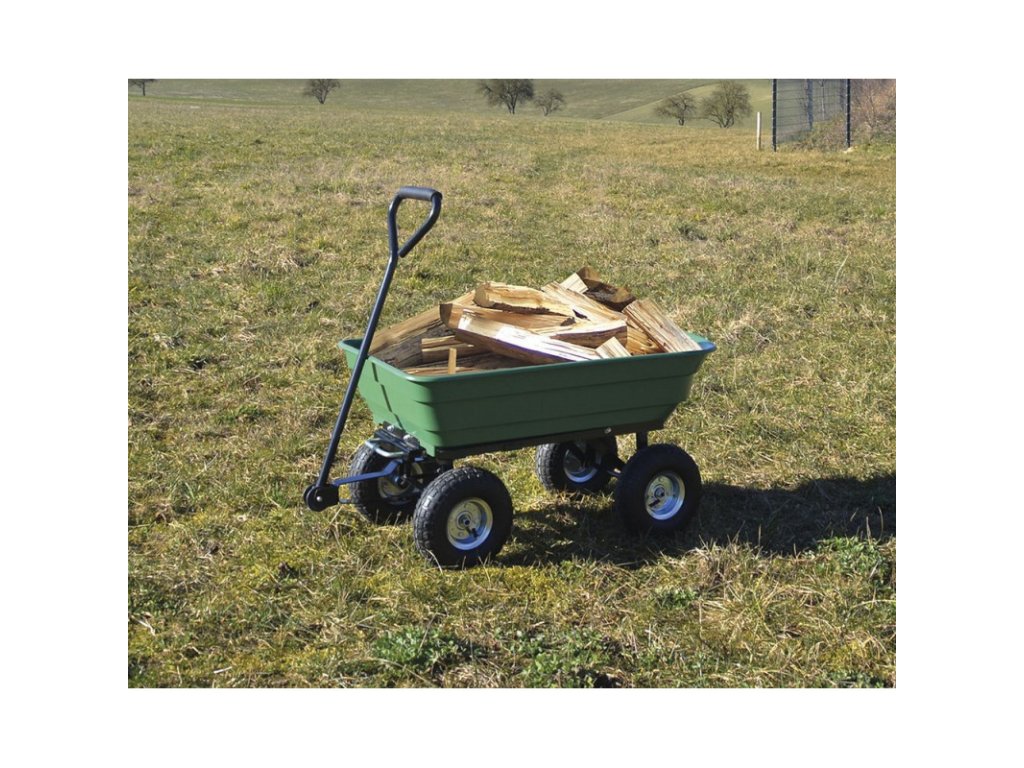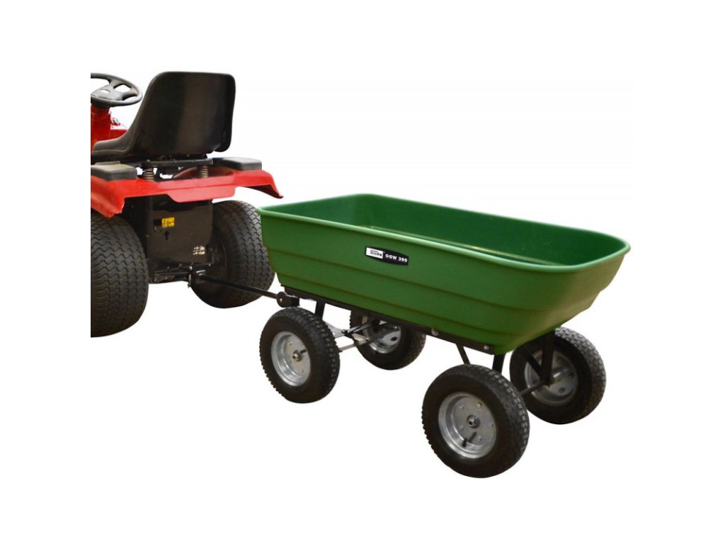 Záhradný vozík na využitie v záhrade, na dvore. Veľké kolesá s guľôčkovými ložiskami a pneumatikami, veľká vaňa. Výklopná funkcia, záves napríklad pre traktorovú kosačku.